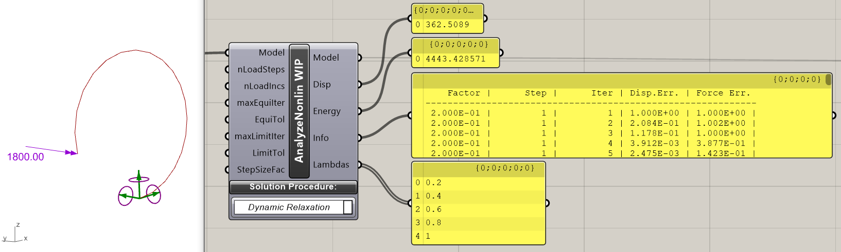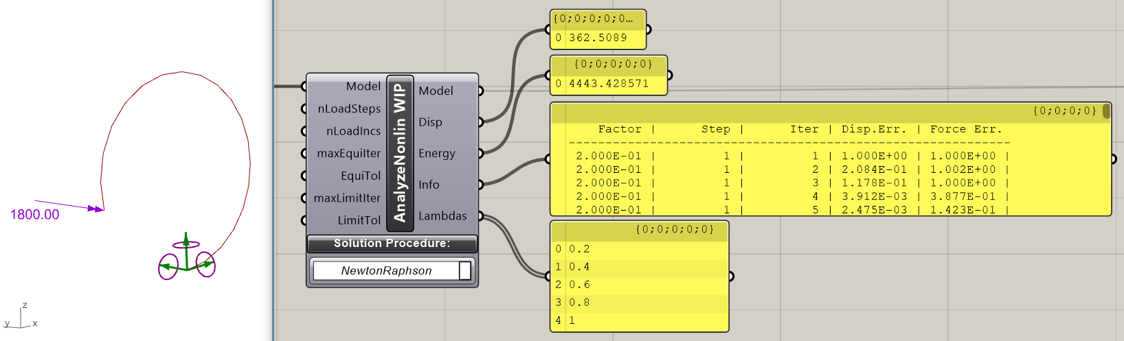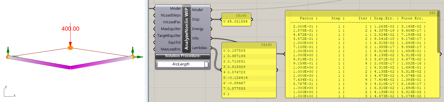 In practice, dynamic relaxation(DR) procedures are used for highly non-linear problems like numerical crash-tests of cars, bolts being shot into a wall, …. The reason is, that implementing non-linear effects as DR code is relatively easy. This ease of implementation comes at the cost of high computational effort: Many iterations are necessary to reach equilibrium with acceptable accuracy. The way out of this is to invest more effort in a better prediction of the displacement increments. In DR-methods the residual forces at the nodes form the basis of predicting the next position of a node. Methods like the Newton-Raphson- or Arc-Length-method use a stiffness matrix for producing displacement predictions. There the computational cost per iteration is higher, but the number of iterations can be made much smaller as compared to DR-methods. With a consistent stiffness matrix quadratic convergence can be achieved under optimal conditions. This means that for the iterative displacement- and force-errors the number of zeros after the decimal separator doubles in each iteration. For the “Analyze Nonlinear WIP”-component this is not yet the case and one reason for the “work in progress”-label. Details on the Newton-Raphson- or Arc-Length methods can be found in [6] on page 102 ff. and 214 ff..