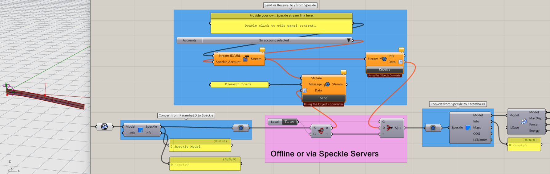 Figure 3.8.4.1 shows an example where a cantilever beam is exported to Speckle. The "Export Model to Speckle" component requires a Karamba3D model as input at the "Model" plug. Additional data of type SpeckleAnalysis.ModelInfo can be provided via the "Info" input, created using Speckle components, and may contain optional model data. The output plug "Speckle" delivers a Speckle structural model, while the "info" output provides feedback on the translation process, including whether all model components were successfully translated. The Speckle model can then be sent to an online repository using Speckle components. For testing purposes, the Speckle model can be immediately converted back into a Karamba3D model (see Fig. 3.8.4.1).